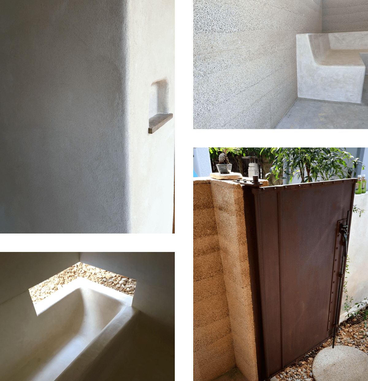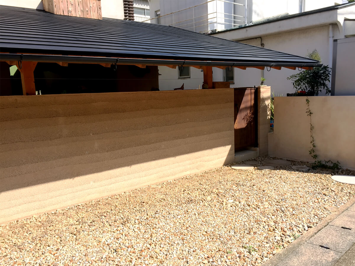 もみがらの版築壁の裏に楽しい仲間とテーブルを囲める半屋外的軒下空間が隠れてる。